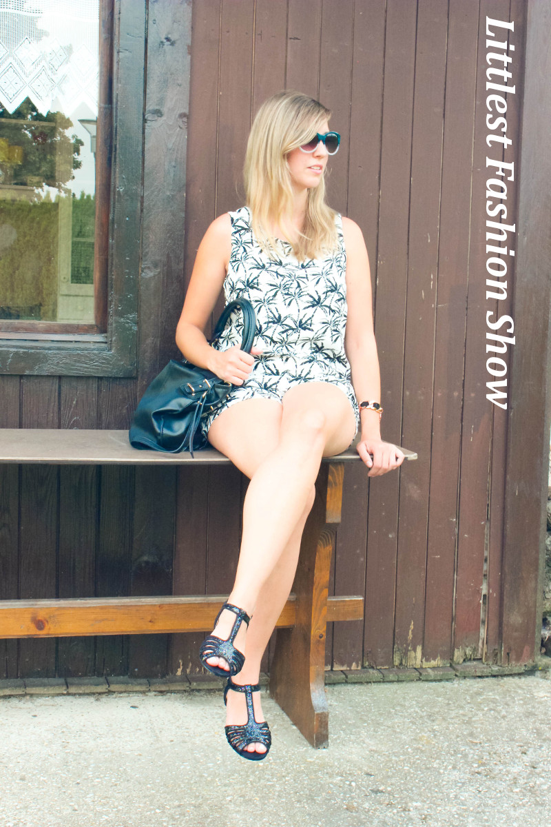 Ich habe einen Overall gefunden, der Palmen aufgedruckt hat. Das Muster macht das Outfit viel aufregender und erinnert mich sofot an die Karibik. Der Print ist nicht so auffällig und trägt somit nicht auf.